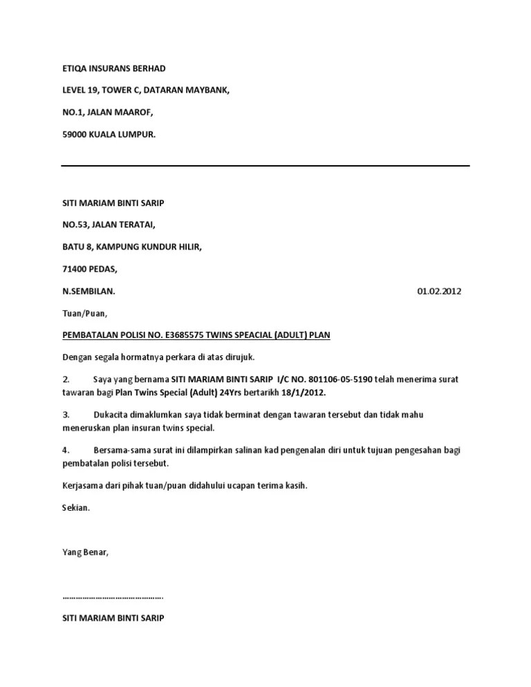 Contoh surat pembatalan polisi insurans etiqa contoh surat pembatalan kontrak insurance.